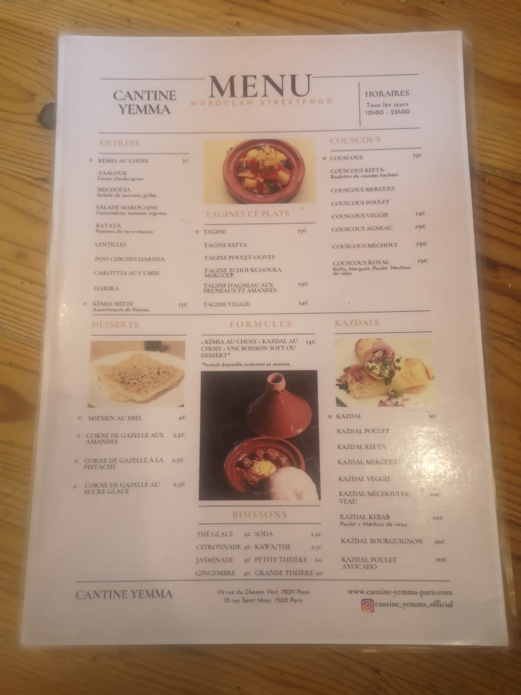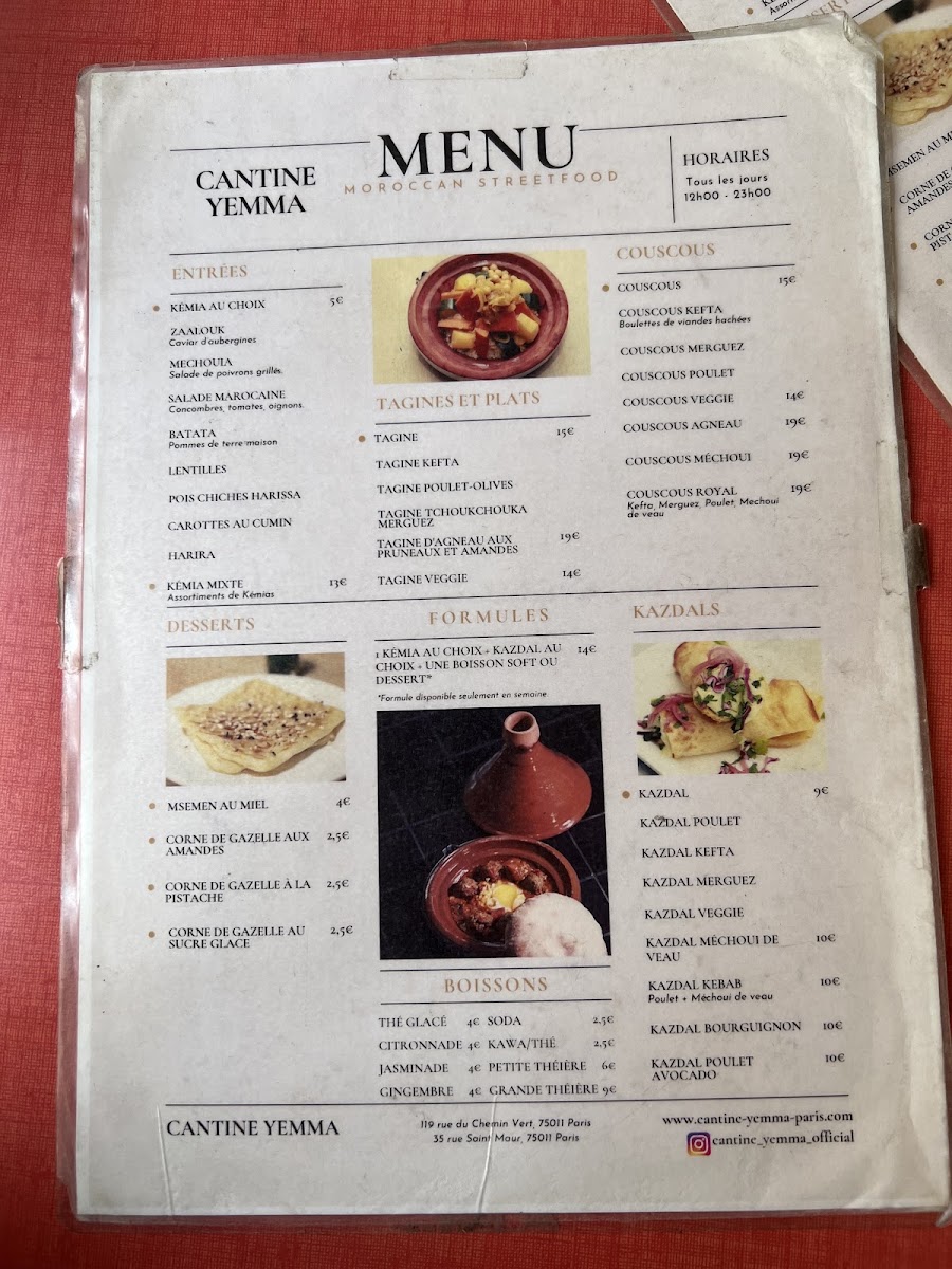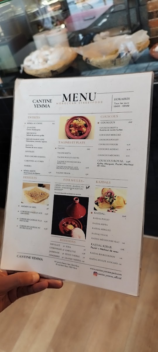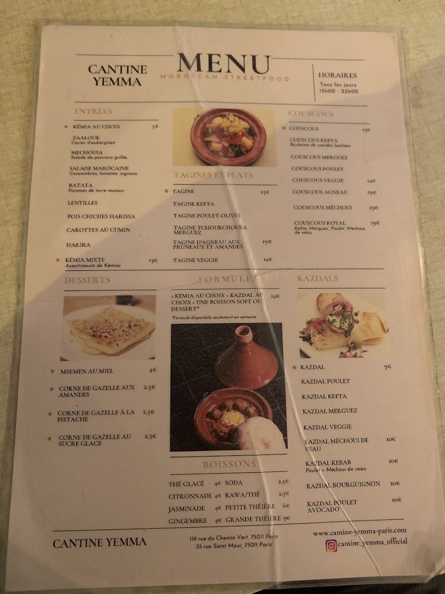 Introducing Cantine Yemma, a hidden gem in the heart of Paris that transports you straight to Morocco with every bite. Located at 119 Rue du Chemin Vert, this Moroccan restaurant offers an enticing menu filled with authentic street food delights. Must-try items include their flavorful Tangine kefta, which bursts with rich flavors, and the versatile Kazdan, a wrap that encapsulates the essence of Moroccan cuisine. For a start, indulge in the Kemia selections, featuring dishes like Mechouia and Zaalook, each priced affordably at just $4.00. End your meal with delectable desserts like Corne De Gazelle and Salade Pamplemousse, promising a sweet finish. Patrons rave about the generous portions and exceptional service, complemented by the aromatic Moroccan tea. Whether you’re visiting after a local exhibition or seeking a culinary adventure, Cantine Yemma is a must-visit for authentic Moroccan flavors.