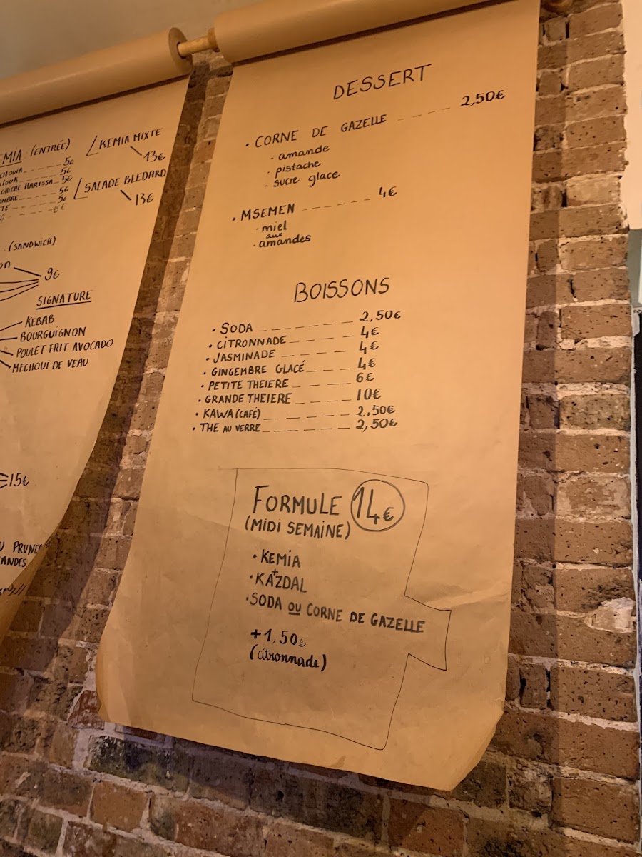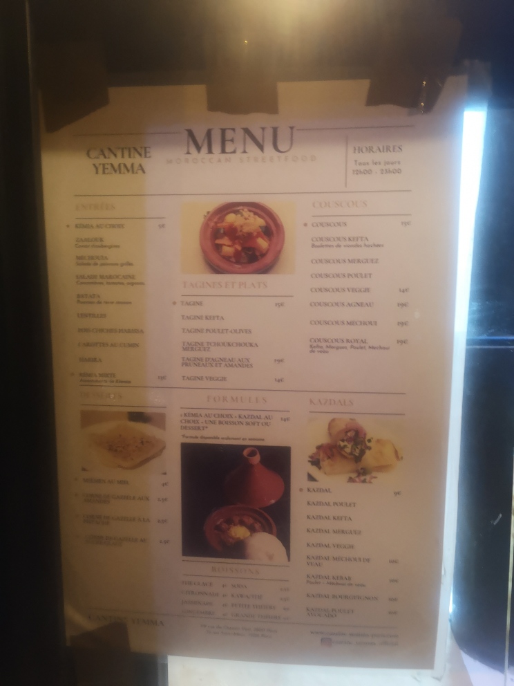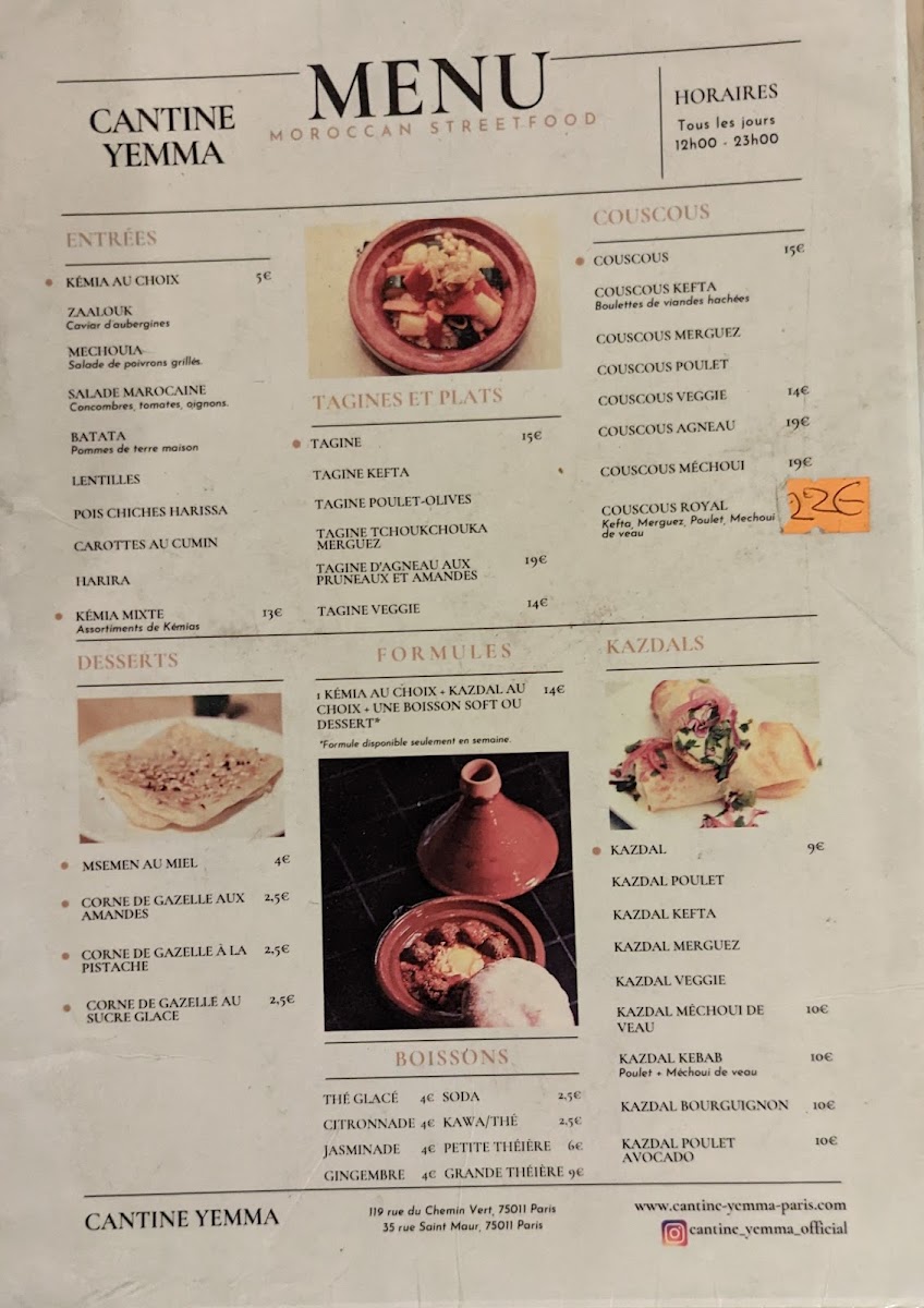 Introducing Cantine Yemma, a hidden gem in the heart of Paris that transports you straight to Morocco with every bite. Located at 119 Rue du Chemin Vert, this Moroccan restaurant offers an enticing menu filled with authentic street food delights. Must-try items include their flavorful Tangine kefta, which bursts with rich flavors, and the versatile Kazdan, a wrap that encapsulates the essence of Moroccan cuisine. For a start, indulge in the Kemia selections, featuring dishes like Mechouia and Zaalook, each priced affordably at just $4.00. End your meal with delectable desserts like Corne De Gazelle and Salade Pamplemousse, promising a sweet finish. Patrons rave about the generous portions and exceptional service, complemented by the aromatic Moroccan tea. Whether you’re visiting after a local exhibition or seeking a culinary adventure, Cantine Yemma is a must-visit for authentic Moroccan flavors.